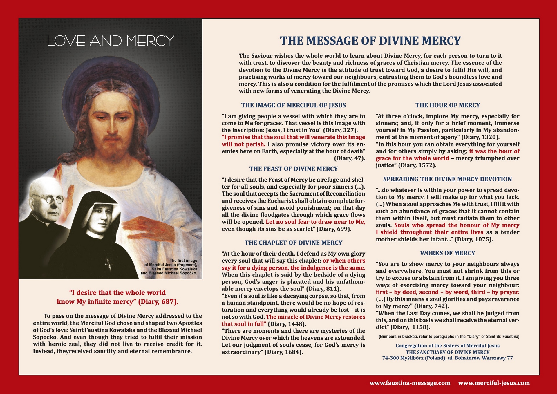 The Congregation of the Sisters of Merciful Jesus, through words, deeds and prayers, implements new forms of worship of Divine Mercy, presented in the Message of Divine Mercy, in 35 religious houses in Poland and abroad, including three missionary centers: in Bolivia, Sierra Leone and South Africa. This message is also spread by lay worshipers of Divine Mercy in online publications, books, reproductions of the image of Merciful Jesus, posters and folders in various languages - made available for evangelization purposes, among others. in prisons, schools and places of pilgrimage.